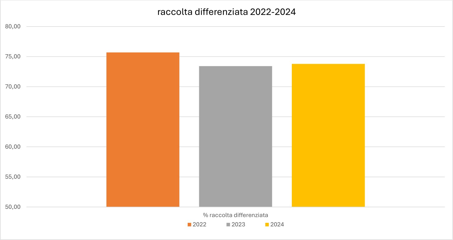 Statistiche raccolta differenziata Anno % raccolta differenziata 2021 74,19 2022 75,70 2023 73,42 2024 73,80